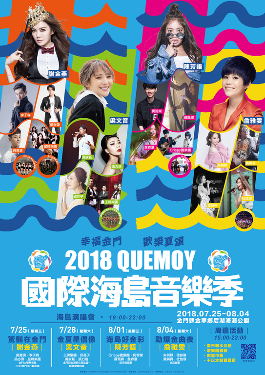 由金門縣金寧鄉公所主辦「2018QUEMOY國際海島音樂季-金寧后湖場」,於 7月25日下午3點至晚間10點開幕登場囉!今年活動自7月25日至8月4日於后湖海濱公園,為期11天的QUEMOY國際海島音樂季將有四場不同主題演唱會,7月25日、7月28日、8月1日、8月4日晚間19:00-22:00,邀請謝金燕、詹雅雯、梁文音及陳芳語等重量級藝人齊聚金門開唱瘋夏日。