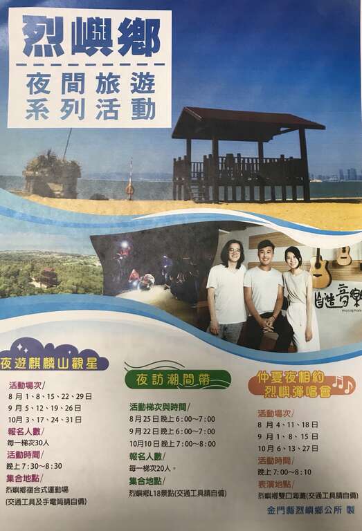 - 活動項目:夜遊麒麟山觀星、夜訪潮間帶、仲夏夜相約烈嶼彈唱會。
