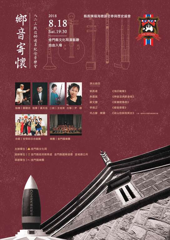 2018適逢八二三砲戰60週年,八二三砲戰對臺灣來說是個重要的歷史戰役,對金門更是一場無可磨滅的記憶傷痕。因此在這富有紀念意義的一年,配合八二三砲戰紀念系列活動,在金門縣文化局邀請下,金門國樂團將於八月十八日晚間七時三十分起,特別規劃以「風獅爺傳奇」為題;和平為訴求;音樂為媒介,透過音樂作品的演繹,聽眾了解到「戰爭無情,和平無價」,讓金門成為兩岸和平的新起點。歡迎鄉親扶老攜幼來觀賞。