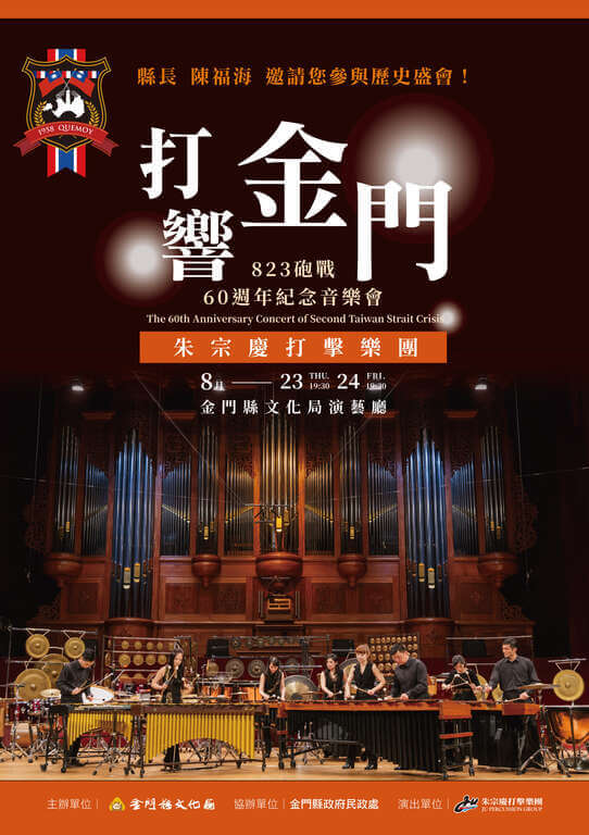 今年8月,適逢823砲戰60週年,受金門縣文化局之邀請,朱宗慶打擊樂團將再度造訪金門,以舉辦音樂會的形式,參與相關紀念活動。8/23(四)、8/24(五)兩日晚間7時30分起,樂團將於金門縣文化局演藝廳演出兩場《打響金門》音樂會,這是一場意義非凡的音樂饗宴,能夠躬逢其盛,樂團藝術總監朱宗慶以及擔綱演出的樂團團員,都表示機會難得也特別期待。