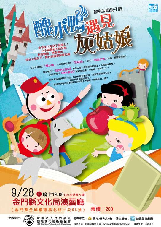 《醜小鴨遇上灰姑娘》將於九月二十八日(星期五)晚上七點起(18:30開放入場),於金門縣文化局演藝廳演出,歡迎有興趣的民眾踴躍購票參與,機會難得。胡璉基金會提醒鄉親注意,本活動除了提供50張票券供清寒弱勢至胡璉基金會申請外(憑清寒、低收入證明,每人兩張為限),一般民眾請購票(200元)進場。購票請上兩廳院售票系統。
