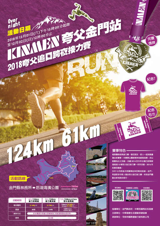 沿續2014至今年,台灣已經舉辦過超過13場夸父追日跨夜接力賽系列活動,2016年拓展至離島澎湖後,主辦單位更堅定了要持續拓展夸父在台灣的跑旅版圖,各站夸父皆行經著名景點、特色小吃,讓跑者們一路跑、一路吃、一路玩,創造屬於自己的路跑回憶!本次金門站以金門縣林務所做為起點,一路跑向終點金城鎮之后湖海濱公園,全長124公里的路程,分為1人惡水超馬組、3人接力菁英組、6人接力挑戰組,讓跑者們號召朋友、家人一起征服金門!