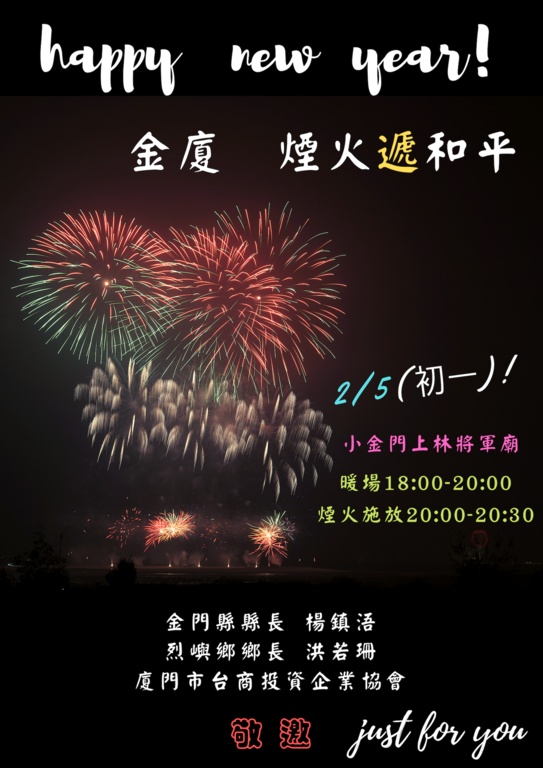 二月五日(大年初一)晚上「2019金廈兩岸春節煙火施放活動」,將於烈嶼鄉上林將軍廟前出海口與廈門市隔海同步施放煙火,今年採用長期供給迪士尼樂園閉園壓軸煙火公司高空煙火,以大口徑高空煙火為主,低空煙火為輔,不同高度搭配下,呈現震撼立體的高低空煙火演出,煙火搭配交響樂的同步演出,交響樂中豐富樂器表現與煙火的互動,打動觀眾在欣賞煙火時的情緒。尾聲時設計採用多次在台北101跨年煙火中擔任主角,更曾經在蒙特婁國際音樂煙火大賽中獲得冠軍殊榮的錦冠瀑布煙火,讓今年的春節煙火更具噱頭與可看性。