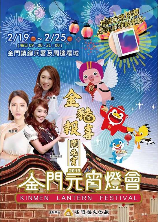 2019金門元宵燈會將於2月19日(農曆元月十五日)歡喜登場,文化局今年特別規劃以「金豬報喜鬧元宵」為主題,營造年節歡樂氣氛,為遊客提供了一個春節踏青出遊的好去處,「白天樂遊金門,晚上賞花燈」,藉由主題花燈動態展演,以及元宵燈會、猜燈謎、花燈競賽、彩繪燈籠及手做元宵湯圓等系列活動,讓金門元宵燈會增添魅力與精彩可期,邀您遊賞金門玩味再三。