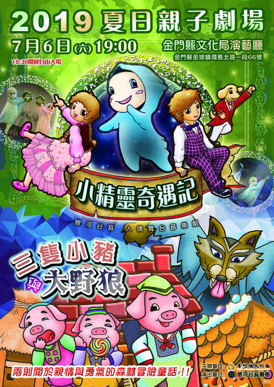 由金門縣文化局主辦的2019夏日親子劇場來囉!邀請銀河谷音劇團於七月六日晚間七時,上演兩齣精緻人偶舞台音樂劇「小精靈奇遇記」及「三隻小豬與大野狼」,敬請期待!