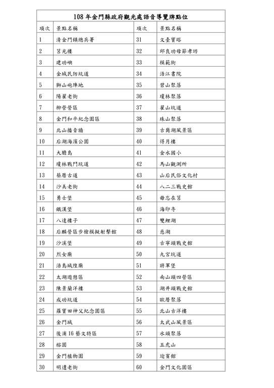 縣府觀光處丁健剛處長表示,原有30多處景點語音導覽牌有三語(中、英、日)解說,今年做全面性替換,除了導覽內容的更新外,更新增了韓語,改以金門電話亭為意象的新導覽牌數量也擴充至60處,除提供給外國旅客更便捷的景點導覽服務,同時也能解決有效的改善地區外語導覽人力不足之問題,不僅是提升對旅客的服務品質,也提升金門國際觀光友善形象。