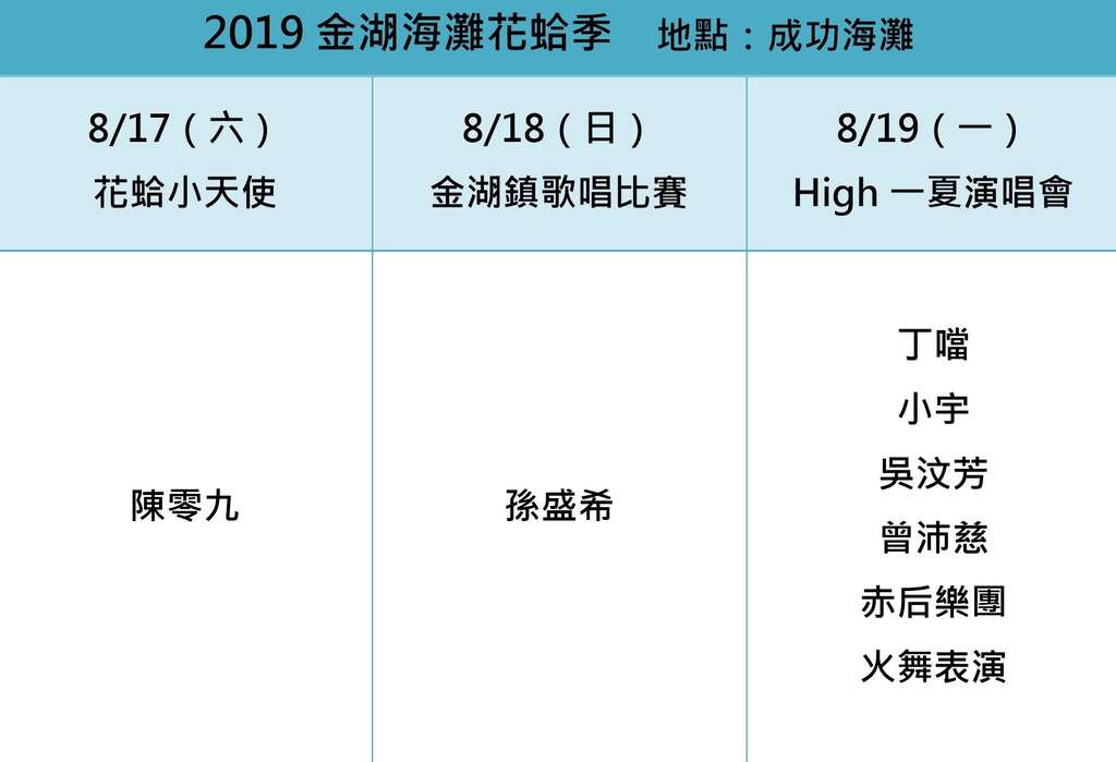 原訂於7月18日至21日在成功出海口舉辦的「2019年金湖海灘花蛤季」,因昨(16)日第五號颱風輕颱「丹娜絲」成形,金湖鎮公所為確保活動品質不受影響,快刀斬亂麻,昨日決定將活動延期,因此「2019年金湖海灘花蛤季」日期將往後延至8月17-19日辦理。