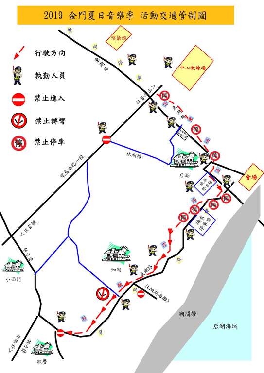 「2019金門夏日音樂季」自108年7月23日起至7月26日止在金寧鄉后湖海濱公園舉辦,金城分局針對活動期間會場周邊實施交通疏導管制,以維護參加活動人員、工作人員行車安全順暢;另活動期間每日17時至24時,公共車船管理處增駛會場接駁專車,往返水頭碼頭、金城及金湖地區。金城分局分局長李益杰貼心呼籲前往參加活動之民眾善加利用公共交通工具,對於行經管制路段之人車,則請配合交通警察及協勤民力現場指揮管制,讓本活動順利進行。