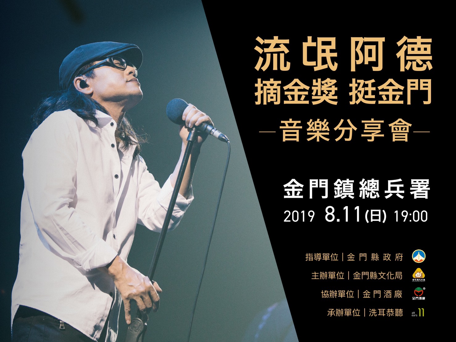 「金曲歌王」流氓阿德八月十一日晚間七時應文化局之邀約,於總兵署辦理「流氓阿德摘金獎挺金門」音樂分享會(見圖)。縣籍搖滾創作歌手流氓阿德以專輯《溫一壺青春下酒》入圍第30屆金曲獎年度專輯獎、最佳台語專輯獎、最佳台語男歌手獎以及最佳裝幀設計獎(蔡書瑀)等四個獎項,最終成功奪下有「台語歌王」之稱的最佳台語男歌手獎。