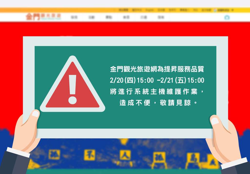 金門觀光旅遊網為提昇服務品質,於2/20(四)PM15:00-2/21(五)PM15:00進行系統主機維護作業,屆時可能造成旅遊網無法瀏覽及使用,主機維護時間將視維護狀況提前或延後結束,造成不便,敬請見諒!