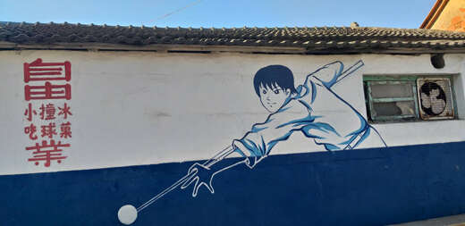 另一端牆面也標示「自由」商店,營業有小吃、冰果、撞球,牆面並畫有帥氣成人撞球模樣,房屋的角落也躲有小貓,呈現早年傳統商店的多樣經營面貌,讓人充滿回憶。