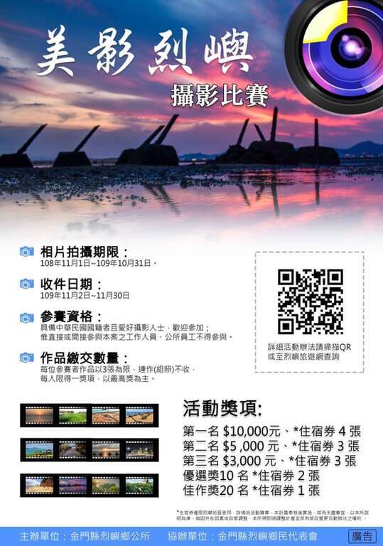 鄉公所說明「美影烈嶼」攝影比賽活動,相片拍攝期限至109年10月31日止。並於109年11月2日至11月30日止,受理收件,逾期不受理。獎金最高有新台幣1萬元,還領有烈嶼鄉合法民宿之住宿券,獎項豐富,鄉公所歡迎愛好攝影者踴躍送件。