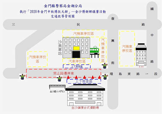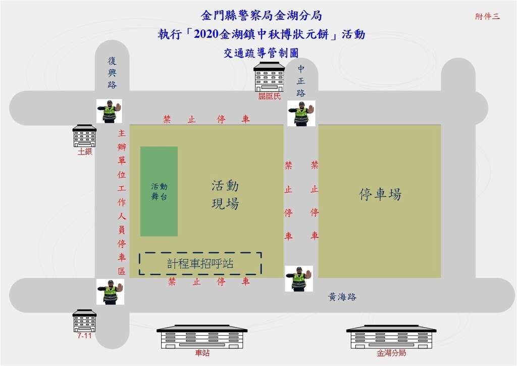 「2020年金門中秋博狀元餅鄉鎮賽活動」,五鄉鎮將統一在9月19日(星期六)於各鄉鎮同步舉行,其中金沙鎮將於16時在金沙鎮複合式運動場,金湖鎮於18時在新市里籃球場舉辦,因應活動可能帶來之人潮與車潮,金湖分局屆時將於會場周邊道路實施交通疏導管制工作,以維道路之行車順暢及人車安全,並呼籲前往參與之民眾可多利用大眾運輸工具,如自行駕車前往會場或行經該路段之駕駛人配合員警或義交人員之指揮。