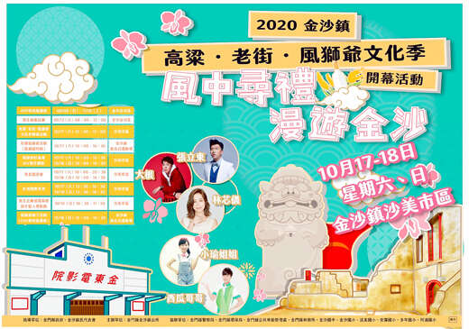 金沙鎮「高粱老街風獅爺文化季」即將登場,訂於10月17日及10月18日假金沙戲院前舉辦,17日上午10時起邀請藝人張立東、大根、林芯儀等到場進行開幕演出;翌日上午則有親子藝人帶動跳及寫生比賽頒獎。金沙鎮公所表示,17及18日兩日下午規劃有在地藝術團隊演出,以及彩繪風獅爺、風獅爺筆筒、風獅爺紅龜粿等DIY活動,以及熱烈進行中的尋找風獅爺活動,廣邀所有鄉親朋友踴躍到場以不同方式體驗金沙之美。