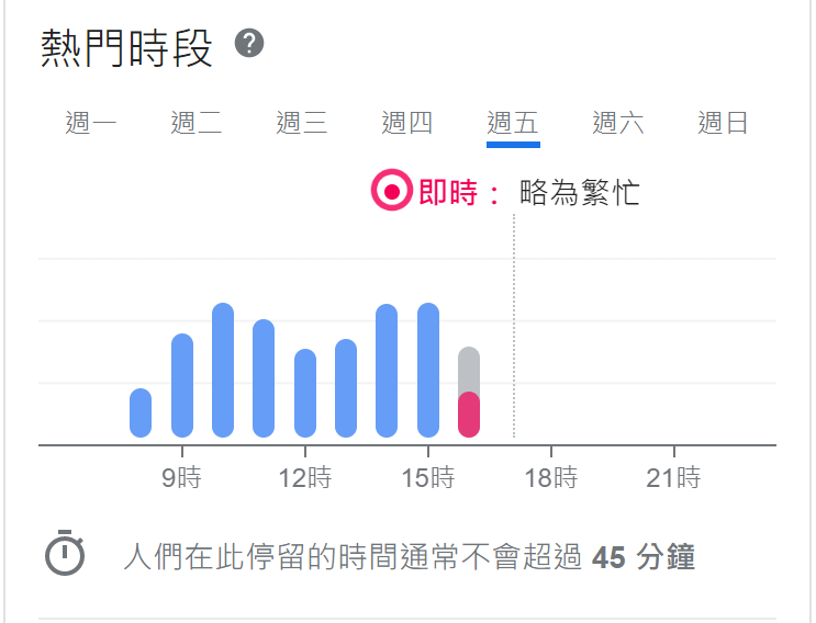 Google「熱門時段」功能,係Google多年來對大眾的定位記錄進行統計熱門時段和停留時間所得之大數據資訊,數據週週滾動更新修正,精準性高,請多多利用。