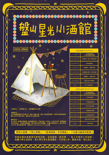 金門縣金寧鄉2020盤山「星光小酒館」活動是金寧鄉公所結合盤山在地商家、金門大學觀光系所舉辦品酒、聽音樂放鬆的活動,也是金寧鄉創新舉行的活動,時間訂於今日、明日下午五時起開始,地點於金寧鄉盤山村頂堡彩繪水溝(網紅景點:為什麼來金門?)。