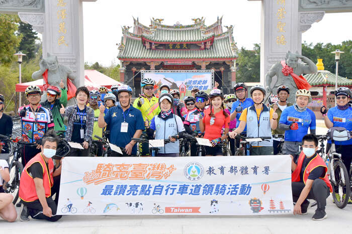 教育部體育署10月31日於金門縣金城鎮天后宮辦理「騎亮臺灣│最讚亮點自行車路線」系列活動第四站「追憶史跡、慢騎金城、騎亮臺灣,帶你領略浯洲島之美」。金門縣金城環鎮自行車道為系列活動唯一一條離島路線,由體育署黃幸玉專門委員、金城鎮公所李誠智鎮長以及單車網紅繞繞(吳旋華),共同帶領民眾慢騎金門,一覽戰地史跡。