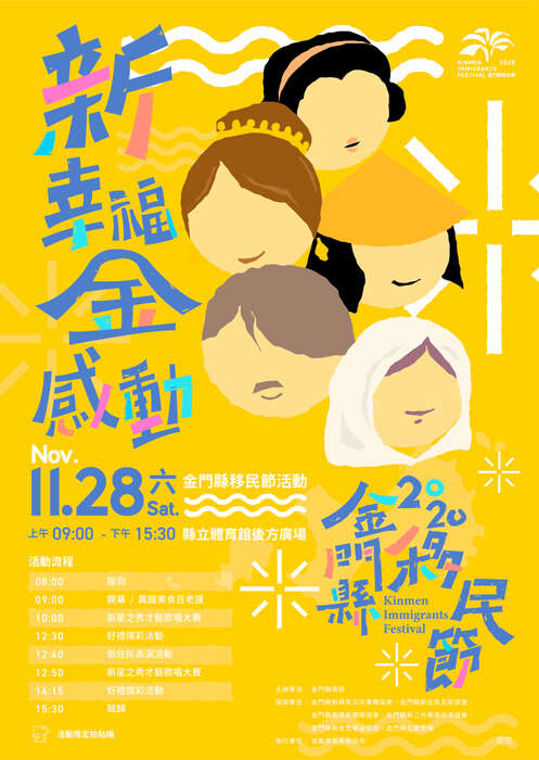 「新幸福‧金感動-2020金門縣移民節」即將在本週六(28日)上午9時起在金門縣立體育館後廣場熱鬧登場!每年所舉辦的「金門縣移民節」皆廣受新移民喜愛,今年特別將活動推至戶外擴大舉辦,除了有新星之秀才藝歌藝競賽,由新住民朋友們展現熱力演出,並鼓勵新移民將家鄉特色菜餚於活動市集推出,不只一解新移民們的思鄉之愁,也讓金門鄉親大飽口福。縣長楊鎮浯歡迎鄉親朋友們一同來為參賽者加油打氣,並至現場享受新移民的文化風情。