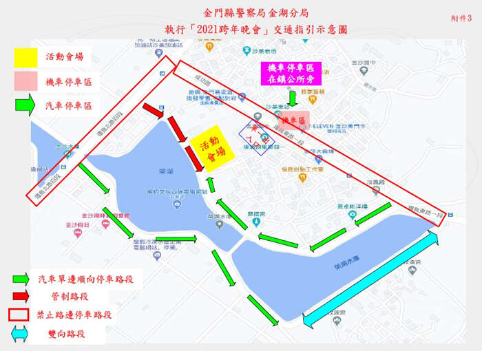 金湖分局指出,2021金門跨年晚會活動將於12月31日19時起至翌日凌晨1時止在金門縣金沙鎮金沙國小操場舉辦,相關交通管制措施如下: