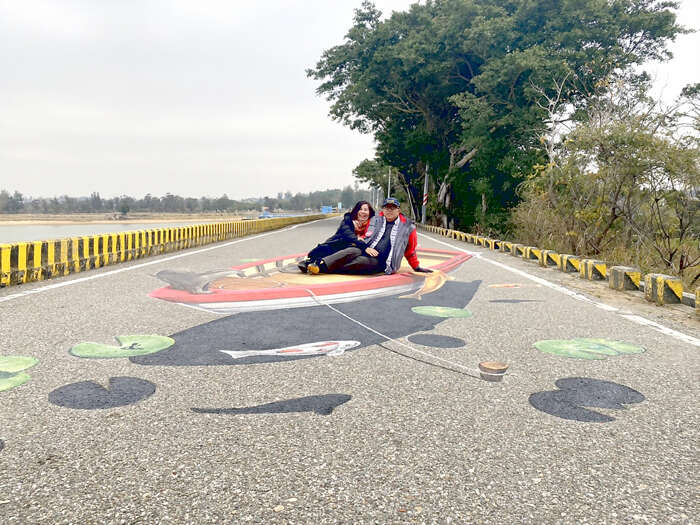 太湖環湖步道去年出現一段3D漂浮斑馬線,創意彩繪工作室的畫家利用彩繪技術造成視覺落差,讓斑馬線有浮在空中的錯覺,吸引不少民眾前往朝聖。在金湖鎮公所的邀請下,畫家在距漂浮斑馬線不遠處再次創作另一件3D作品,繫在木樁上的小船,船上有歐亞水獺,船側有著躍起的錦鯉、優游的魚兒和漂浮的蓮葉,讓遊太湖的民眾又多了拍照打卡的新熱點。