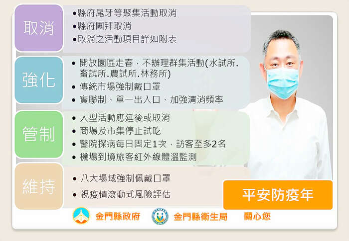 因應近一週來,台灣新增多例新冠肺炎本土確診個案,疫情再度緊繃;緊接年節返鄉人潮增加,民眾流動快速,為確保縣民健康安全、完善防疫各項環節,金門縣政府於22日上午10時由楊鎮浯縣長親自主持召開「因應新冠肺炎疫情近期各項活動辦理及防疫措施會議」,檢視春節期間活動是否符合中央訂定之「公眾集會」及「大型活動防疫規範」之防疫規定,並以申請「電子圍籬」為輔,強化各項活動之安全性。