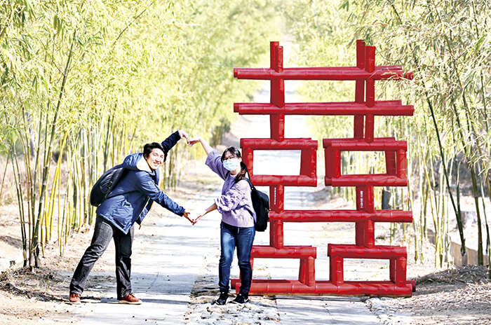 迎接牛年新春,金門植物園洋溢熱鬧喜氣,6日邀請「將軍書法家」鄭有諒揮毫,用軍事、精神標語寫下春聯門葉,分送入園踏青的遊客外,並在竹林隧道豎立大「囍」裝置藝術,為春節遊金門再增添一處打卡熱點。