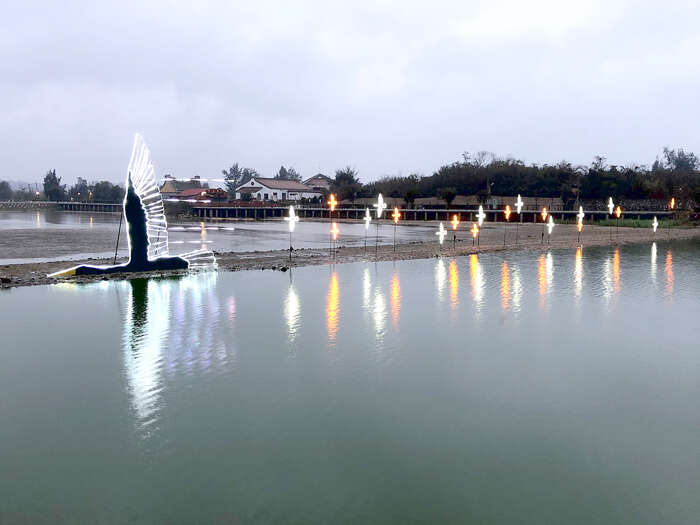 1、水岸藝術燈區:比翼雙飛-在愛裡迎光飛翔;作品說明:鸕鶿常以人字形或一字形井然有序的排列隊伍翱翔於天際,乘著夕陽歸巢美景已成為金門世界級的生態景觀之一。藉以祝福有情人終成眷屬。