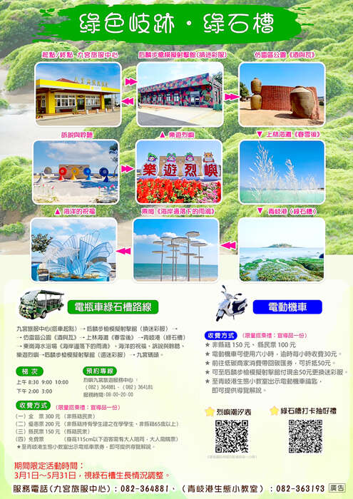 綠石槽不一定只有北海岸的老梅,小金門也有!烈嶼鄉公所為提供到烈嶼鄉遊客品味綠石槽之美,於春季推出「綠色岐跡‧綠石槽電瓶車專線」。即日起至5月31日,遊客可於烈嶼鄉九宮旅服中心,購票搭乘電瓶車或租借電動機車,遊歷青岐海岸的綠石槽美景。預約搭乘電瓶車可撥打082-364881,預約租借電動機車可撥打082-364181,另需諮詢可撥打鄉公所服務台專線082-364500。