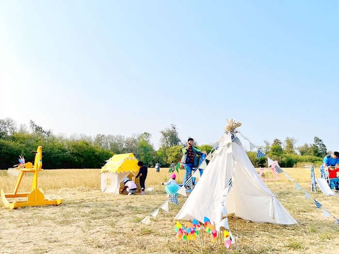 地景的另一亮點,便是超巨大化的彩虹風車隨風轉動,還有上百個彩虹小風車搭建而成的風車隧道,當風從麥田間隙呼嘯而過,也帶動了風車長廊中,風車連帶轉動,就像進入時間迴廊,連大人也能在一瞬間,回到最無憂無慮的快樂童年。