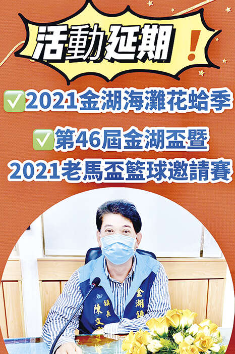 新冠肺炎疫情未歇,金湖鎮公所昨日宣布,原訂於7月9日至7月11日將舉辦的「2021金湖海灘花蛤季」,以及7月16日至7月25日舉辦的「第46屆金湖盃暨2021老馬盃籃球邀請賽」,考量防疫需求,活動決定延期舉辦,後續辦理時間將視中央流行疫情指揮中心防疫政策另行通知。