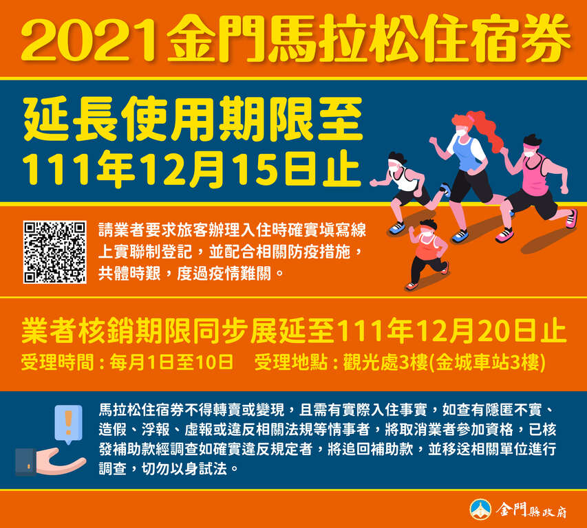 新冠肺炎疫情在出現變種病毒後,再次衝擊各行各業,隨著後續防疫的不確定性增加,金門縣政府宣布,2021金門馬拉松住宿券使用期限延長一年,調整至111年12月15日止,期待達到疫情趨緩後分流來金的旅遊目的,降低疫情風險。