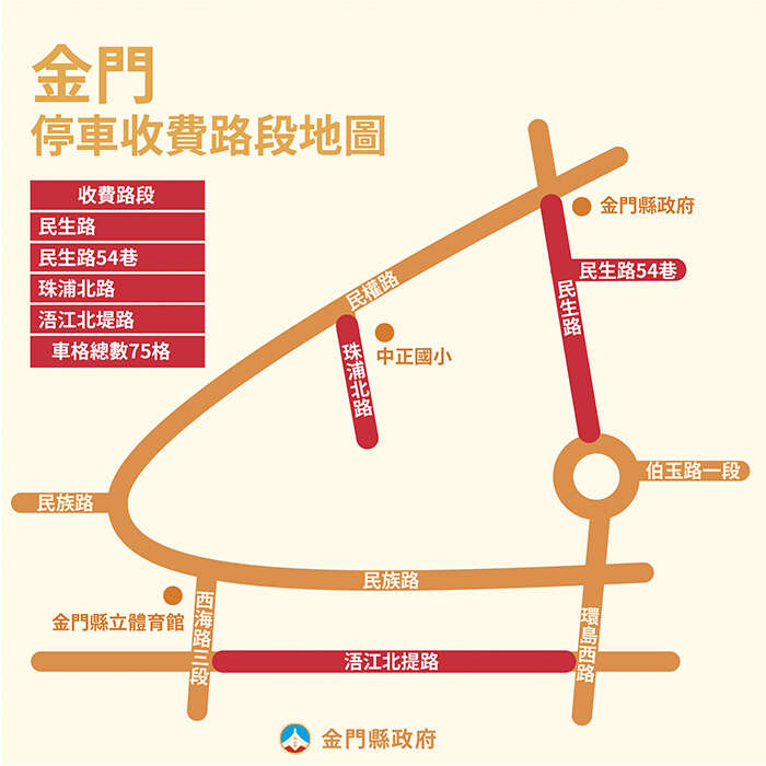 縣府指出,本次在金城鎮率先執行收費管理的路段為市區的路邊停車格,分別在民生路、民生路54巷、珠浦北路、浯江北堤,收費時間為上午九時至下午八時,每三十分鐘十五元起,依車種給予不同優惠並採累進費率計價,如需要免費停車的在地民眾,縣府建議可以往市區周邊浯江北堤兩側路外停車場、鎮公所後方路外停車場、金城分局旁路外停車場及金門高中路外停車場等都可提供民眾免費停車,縣府期許市區精華路段的路邊停車位納入收費管理後,營造在地商圈活絡的有利條件。