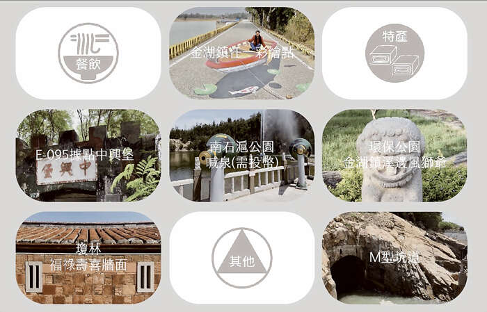金湖鎮公所表示,此次活動九宮格規劃6個金湖鎮景點,包括料羅南石滬公園-喊泉(需投幣10元)、瓊林-福祿壽喜牆面、中興堡、環保公園-溪邊風獅爺、M型坑道、金湖鎮內任一彩繪點。除了找出隱藏版景點外,為了振興地方經濟及活絡地方產業,也另外加入商家,九宮格內有三格是必須在金湖轄區商家消費才可蓋章,商家分成三大類,分別為:特產業、餐飲業、其它類。