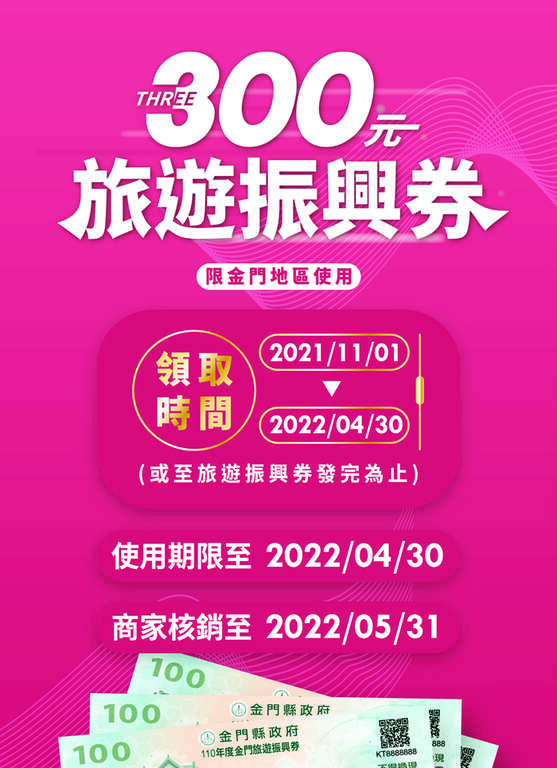 建設處處長陳祥麟表示,針對金門限定3,000元振興券,縣府特別建置「金門振興券商家加碼促銷活動專區」,目前已有超過100家業者加入,使用期限至2022年4月30日為止。而此次Line熱點活動截至10月6日報名人數已達3.6萬人,更首次開出LINE Points200萬點的大紅包,完成9天活動集章用戶就可拿到30點。