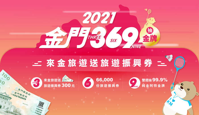 觀光處處長丁健剛指出,「金門369,來金旅遊抽金牌」活動對象為「自由行」及「旅行團」旅客。「3」就是來金旅遊,送你旅遊振興券300元;「6」就是總計6萬6,000份的旅遊振興券;「9」就是抽99.9%純金金牌送給你。遊客只要於活動期間搭機來金,就有機會抽中金牌!活動預計自2021年11月1日起至2022年4月30日止(或至旅遊振興券發完為止)。