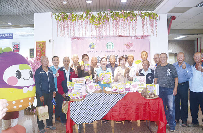 「烈嶼芋唔免哺」,小金門檳心芋頭「香、鬆、綿」、入口即化的口感,遠近馳名。金門縣農會搭配烈嶼鄉公所於本週六舉辦芋頭季系列活動,昨日在鄉公所舉辦芋頭香腸、芋頭貢丸、芋頭角新品發表會。縣農會理事長許玉昭、烈嶼鄉長洪若珊、鄉代會主席方駿洋、農會總幹事文水成和農友共同推銷農會與台中市大安區農會飛天豬品牌合作推出芋頭香腸、貢丸系列產品,歡迎消費者嚐鮮。