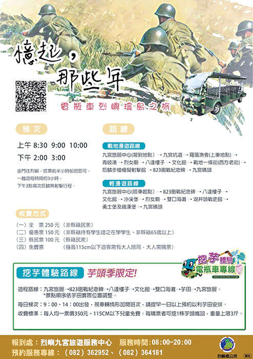 烈嶼鄉公所配合芋頭季期間推出限定挖芋體驗電瓶車專線,遊程費用均一價350元/人,115公分以下孩童免費,購票遊客可挖掘1株芋頭攜回(上限3斤),每日上下午各一場次(9時、14時發車),請提早1日以上預約,預約專線(082)362952。鄉長洪若珊歡迎鄉親、遊客闔家一起來體驗搭電瓶車漫遊烈嶼,享受挖芋樂趣。