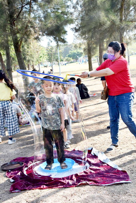 6日的草地野餐活動,現場有家庭準備好小蛋糕,幫家中的小朋友慶生;有一家老小,共二十一口,到場享受秋日午後的好天氣。草地上,大大小小的充氣彩球滾著,隨著輕風揚起滿天飛揚的泡泡,這個周末的莒光公園很是熱鬧,充滿著小朋友的笑聲。