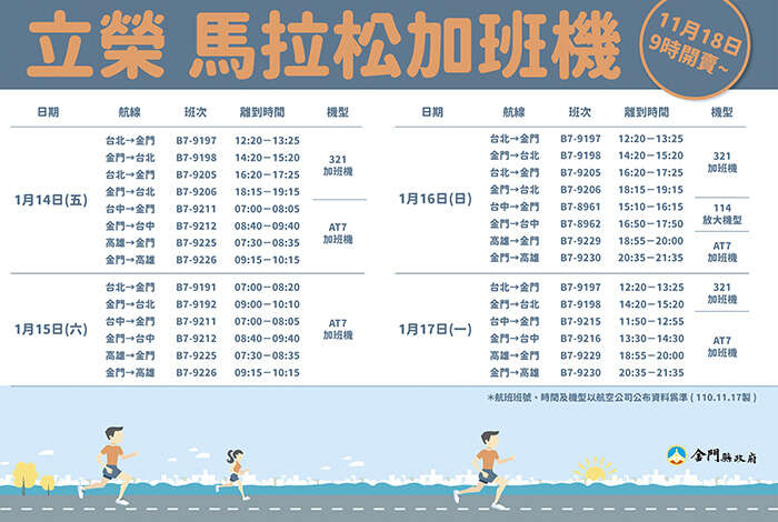 而航班班號、時間及機型仍以航空公司公布資料為準。另為免跑友訂不到機位而對金門馬拉松卻步,縣府也將與中華民國路跑協會持續調查跑友訂位狀況,若統計達一定人數將據以協調加班相關事宜,縣府竭誠歡迎各界跑友蒞金締造佳績,同時領略金門美風光、好人情。