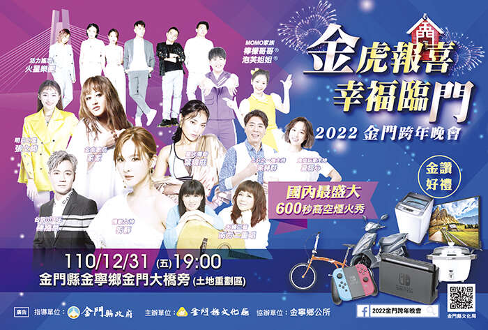 這項由金門縣政府指導,金門縣文化局主辦,金寧鄉公所協辦的「2022金門跨年晚會」,金門縣政府和金門縣文化局為迎接新的一年到來,特別邀請「國內最強卡司的表演藝人」,適合老、中、青、小朋友觀賞,並結合「最盛大600秒高空煙火秀」施放,節目精采絕倫,歡迎鄉親踴躍參加。