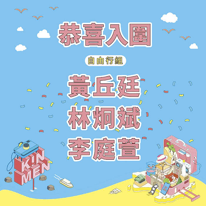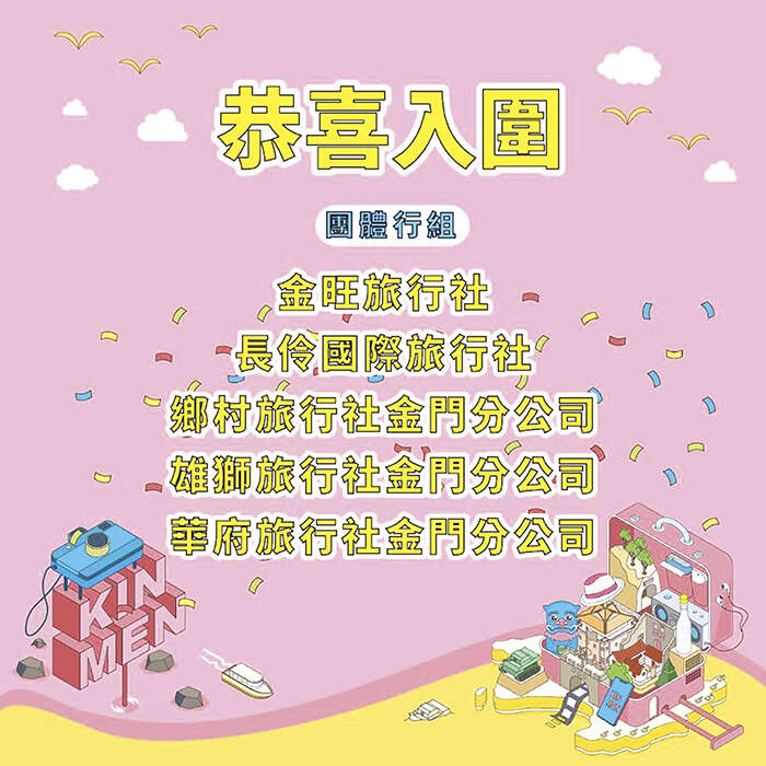 勇闖金門浪漫秘境遊程入圍者如下,自由行組:黃丘廷、林炯斌、李庭萱;團體行組:金旺旅行社、長伶旅行社、鄉村旅行社金門分公司、雄獅旅行社金門分公司、華府旅行社金門分公司。