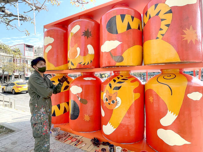 而首度參與金門春節交通節點布置的金門插畫藝術家吳騏指出,農曆新年為生肖虎年,透過虎年節慶的概念,在金酒公司的大酒甕上創作很有趣,除深具金門地方創作特色外,他也構思透過兩隻老虎一上一下、互相對望的構圖,呈現流動循環之樣,傳達出新年充滿律動活力的想像。而過往「老虎」在一般民眾心中,有兇猛之感,也特別以可愛的插畫形式呈現。此外,這次的作品也是首度與由他的父親吳惠民與妹妹吳彤一家人協力創作而成,期藉以呈現傳統農曆年一家團圓的溫馨氣氛,也希望能成為打卡亮點。