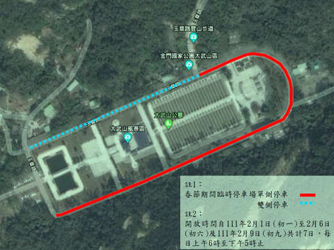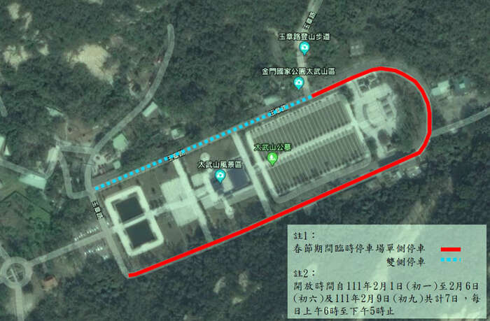 金管處表示,由於春節期間將湧入大量遊客,配合金門縣政府警察局及內政部警政署保安警察第七總隊第四大隊,於春節期間實施交通疏導,另亦協調陸軍金門防衛指揮部於2月1日(初一)至2月6日(初六)及2月9日(初九),共計七日,每日上午六時至下午五時止,開放太武公墓內側(靠公墓左邊單側)道路做為民眾登山之臨時停車場,籲請前來遊憩的民眾注意交通疏導事項,也請大家多加利用大眾交通工具。
