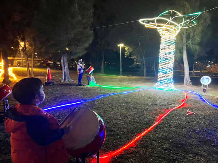 2022金門元宵燈節15日晚間在莒光湖畔的共融公園舉行,伴隨著音樂水舞及絢麗的煙火,啟動達半個月的燈節地景藝術展出。