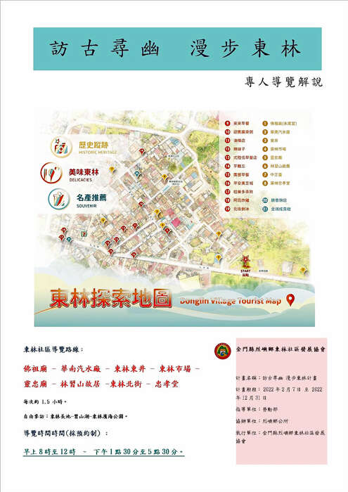 烈嶼鄉東林社區發展協會所主辦的「訪古尋幽 漫步東林」計畫(見圖),自今年2月7日開始,至12月31日止,以精彩的導覽遊程、專業的導覽人員,帶領大家以尋幽訪古的心情,穿梭在地歷史,探索在地文化資產,以深度旅遊的方式走讀地方文史場域,漫步超過八百年歷史的東林傳統聚落,體驗周邊巷弄的文史生態,開啟一趟美麗的旅程。