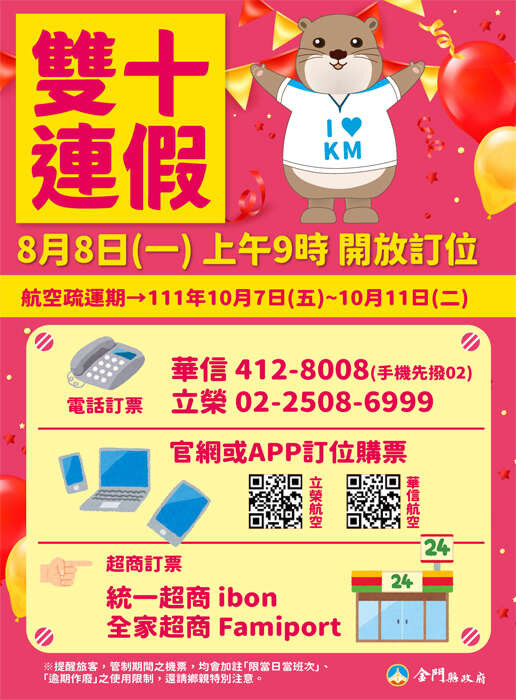 縣府提醒旅客,本次雙十連假尖峰時段10月7日至9日臺灣出發往金門方向,以及10月9日至11日金門出發回臺灣方向之機票,均會加註「限當日當班次」、「逾期作廢」之使用限制,俾使有限之空運資源獲得更有效之利用。