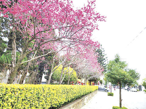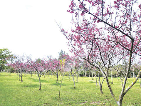金門縣農試所所內種植的山櫻花,位於該所內的風車迷宮旁,種有一整片的櫻花林,目前也正陸續綻放,粉紅色澤的櫻花花瓣,撫慰了欣賞者的心,民眾可以趁著開花期間,闔家大小一同前往遊覽欣賞。