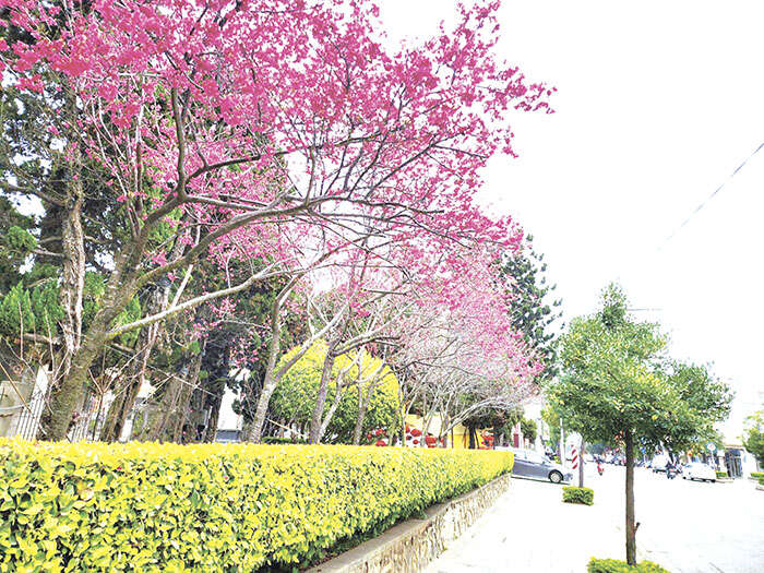 而陽翟老街前的空地,數十株櫻花樹十分醒目,近期也逐漸盛開,民眾不妨可利用假日到陽翟老街逛街踏青,順便打卡拍照,度過愜意的假日午後時光。
