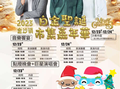 金沙鎮公所訂於12月23、24日(星期六、日)於沙美市區舉辦「2023金沙白金聖誕市集嘉年華」(見圖),除了有市集和精彩的表演,凡完成闖關任務即可兌換限量的創意盆栽積木聖誕樹。重頭戲8公尺高的聖誕樹主燈將於23日晚間6時起開幕點亮,沿街(金沙戲院前)將以應景燈飾打造最浪漫的白金金沙聖誕夜,歡迎鄉親踴躍共襄盛舉。