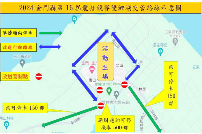 金城分局表示,端午節龍舟競賽活動乃地區年度例行性之節慶活動,全程包含龍舟競賽、民俗才藝表演、寫生比賽、關聖帝君祭禮及龍舟開光點睛儀式,屆時有來自本縣各鄉鎮之龍舟隊伍參加,共計有24隊將角逐各組錦標,預計參與民眾約1,200人,該分局將在活動期間,針對周邊道路實施交通管制措施如下: